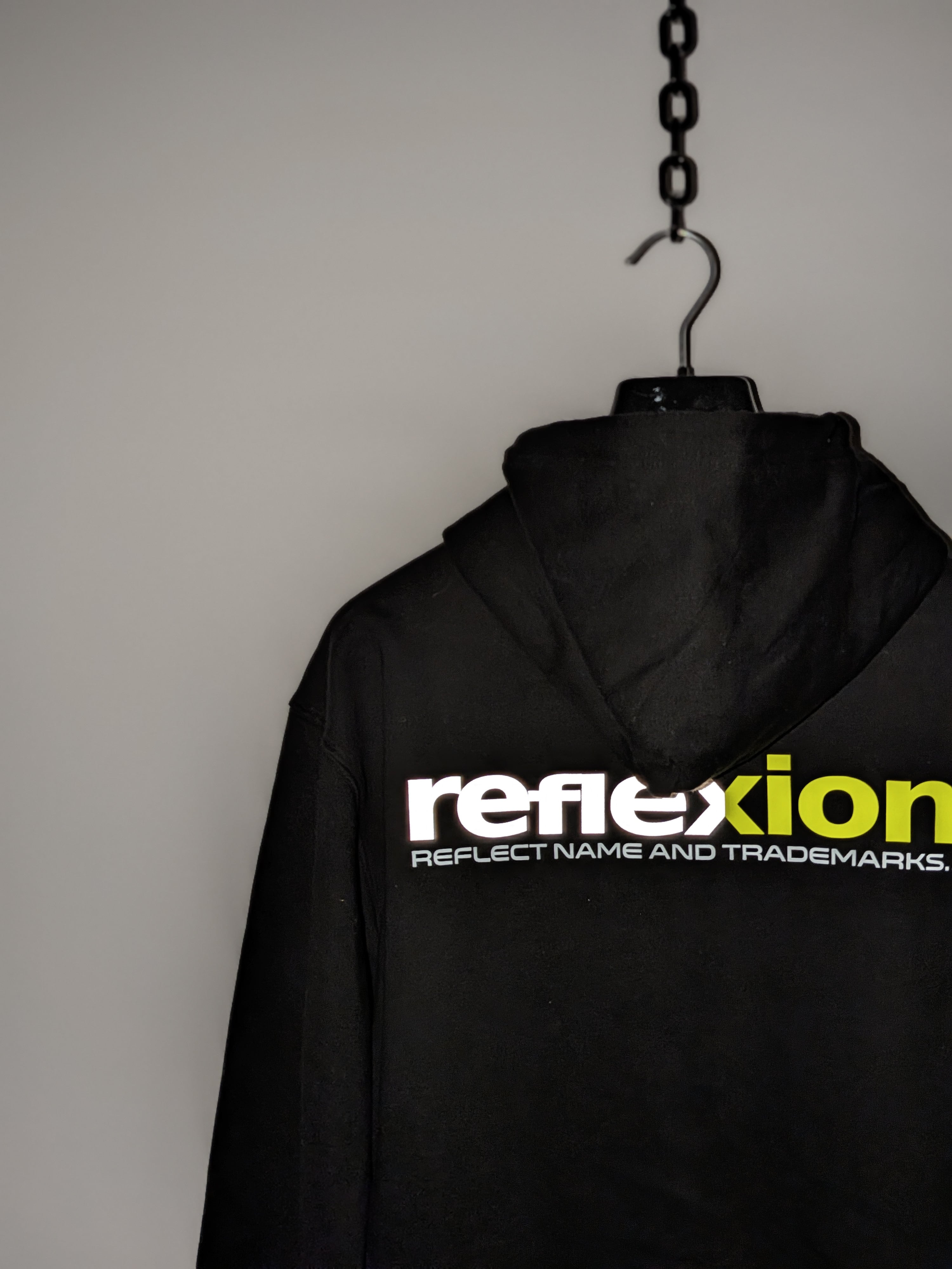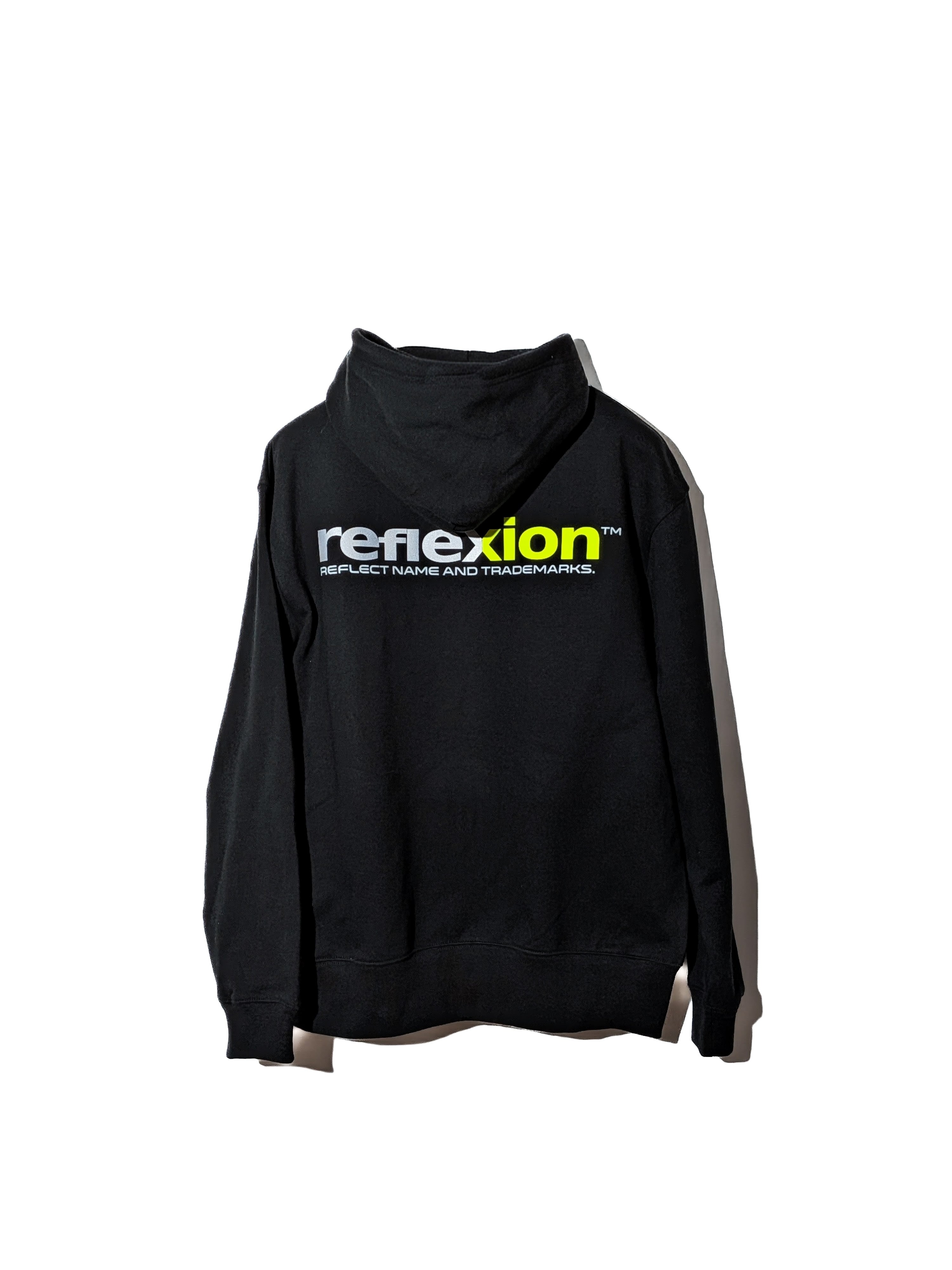 REFLEXION™ LOGOにREFLCTIVE素材と抜群の発色と立体感ある蛍光ネオンイエロープリント 通常のプリントと3段階に分けたプリント技法でダイナミックバックロゴを配置。