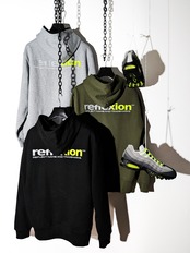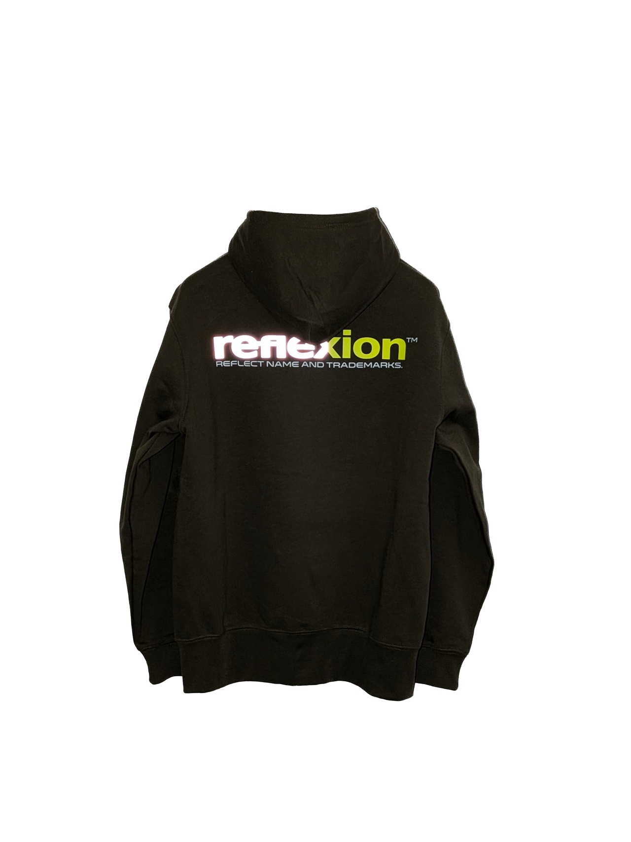 REFLEXION™ LOGOにREFLCTIVE素材と抜群の発色と立体感ある蛍光ネオンイエロープリント 通常のプリントと3段階に分けたプリント技法でダイナミックバックロゴを配置。