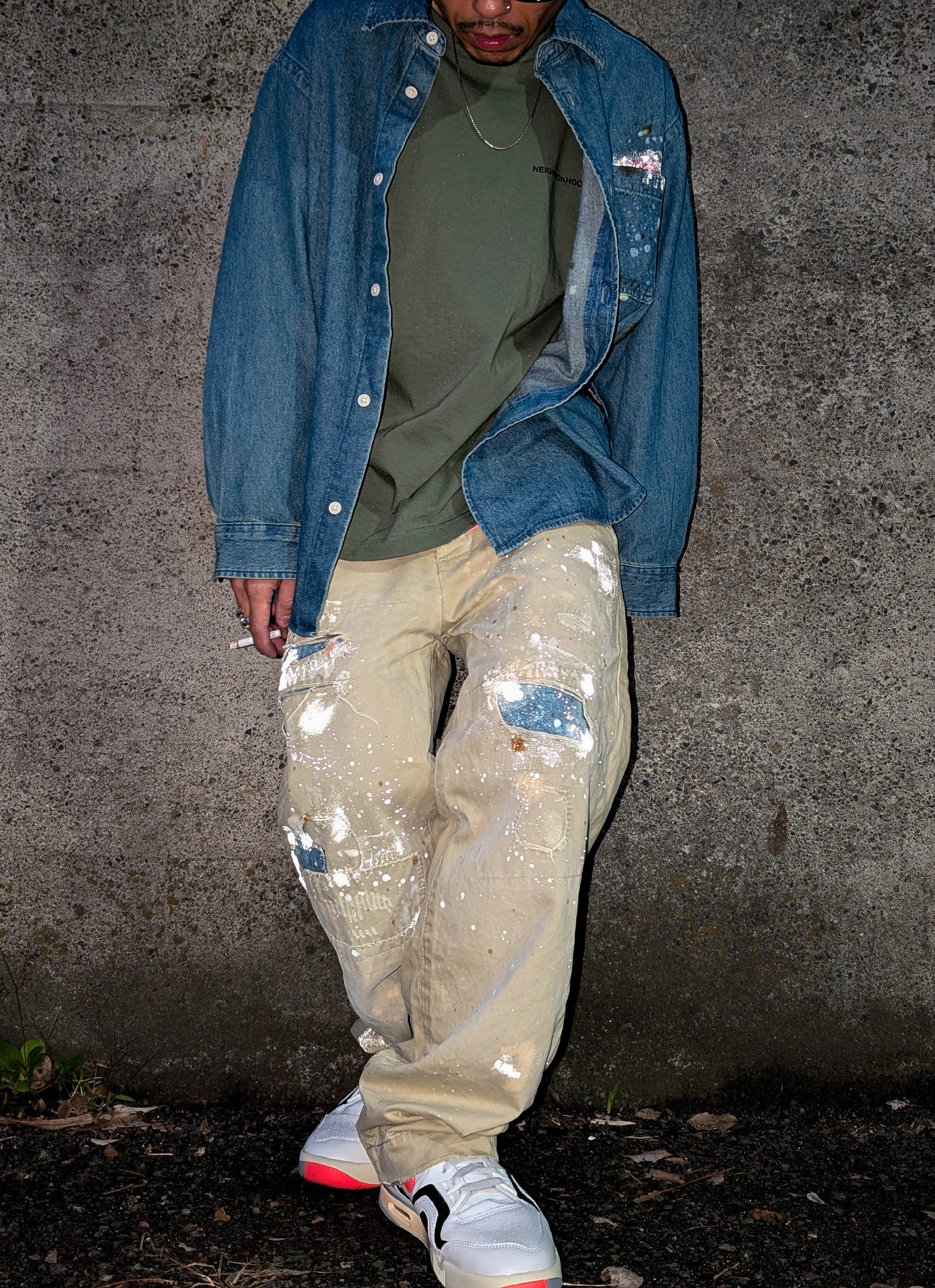 90年代シーンに一世風靡したLOOSE FIT CHINOをREFLEXIONが現代版にMASHUP。あの頃から履きこんだ様なダメージ クラッシュ リメイク オイル染み 色褪せ ペインティング REALなVINTAGE AGING加工を1点1点丁寧に施したHARD WORKER COLLECTION。